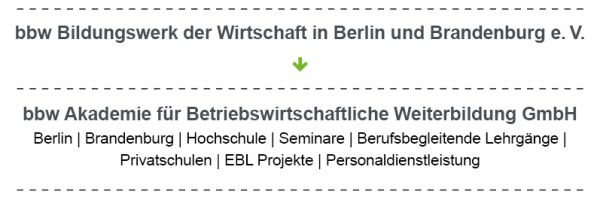 The bbw Bildungswerk der Wirtschaft in Berlin und Brandenburg (short form: bbw Group) consists of four independent and non-profit companies. The bbw Akademie für Betriebswirtschaftliche Weiterbildung GmbH is a supporter of the bbw Hochschule - University of Applied Sciences. The bbw Group has 37 locations in Berlin and Brandenburg and seven in China (status: 12/2016)