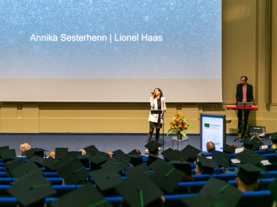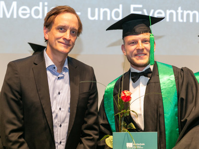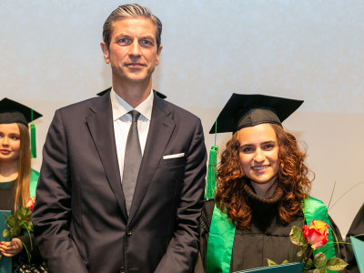 The highlight of the day arrived: the presentation of certificates! In groups, the graduates were called onto the stage by Ursula Schwill based on their completed degree program. An enthusiastic applause from the attendees accompanied them as they walked on stage to receive their certificates from their program director. Subsequently, the outstanding achievements of the students were acknowledged: Prof. Dr.-Ing. Hafer and Dirk Linn honored the top performers of the year and the program in both the bachelor's and master's categories. This was followed by another musical performance by the fantastic music duo. Dr. Lucht and Anastija Radke, Managing Partner of KVL Group, awarded the winners of the prize for the best bachelor's and master's theses in the field of real estate management. On behalf of all graduates, Malou Vasseghi, graduate of the Corporate Communication program, delivered a heartfelt thank-you speech.