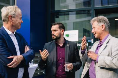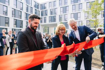 Christian Amsinck, Vorsitzender des Kuratoriums der Hochschule, eröffnete den neuen Standort zusammen mit dem Bezirksstadtrat von Treptow-Köpenick, Marco Brauchmann, und der Kanzlerin der bbw Hochschule, Ursula Schwill. Das symbolische Zerschneiden des roten Bands besiegelte den offiziellen Neuanfang.