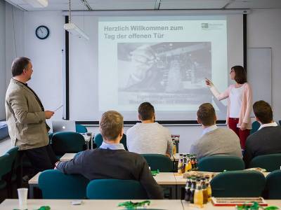 Ganz im Zeichen des 10-jährigen Jubiläums gestalteten die Studierenden der verschiedensten Fachrichtungen ihre Studienräume, um die Neugierigen umfassend über Dauer des Studiums, Spezialisierungen, Praktika und Perspektiven nach dem Studium etc. informieren zu können. So richteten die Studierenden der Fachrichtung Wirtschaftskommunikation ein imaginäres Fotostudio ein, während die Handelsmanager mit Naschereien aus ihren delegierenden Firmen lockten.