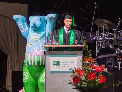 "Ohne eine Vision oder ein Ziel geht es nicht. Man muss an sich selbst glauben und sich nicht scheuen, um Hilfe zu bitten." erzählt Rutwik Hrushikesh Godse als er im Mai 2019 die Rede auf der Absolventenfeier hält und zusammen mit 86 weiteren Absolvent:innen sein Abschlusszeugnis als Jahrgangsbester in seinem Studiengang erhält. Nachdem das Publikum durch die Kanzlerin der bbw Hochschule begrüßt wurde, ergriff Dr. Andreas Forner, Geschäftsführer der bbw Akademie - Trägerin der bbw Hochschule, das Wort um die Absolvent:innen und deren Freunde und Familien willkommen zu heißen. Einer der Höhepunkte des Abends war die Festrede von Jasmin Taylor, die den Absolvent:innen ihre interessante Lebensgeschichte erzählte, die von vielen Höhen und Tiefen geprägt war. "Das Leben geht immer weiter und es ist immer eure Entscheidung, wie es weitergehen soll. Ihr habt euer Leben in der Hand und könnt es jederzeit ändern."